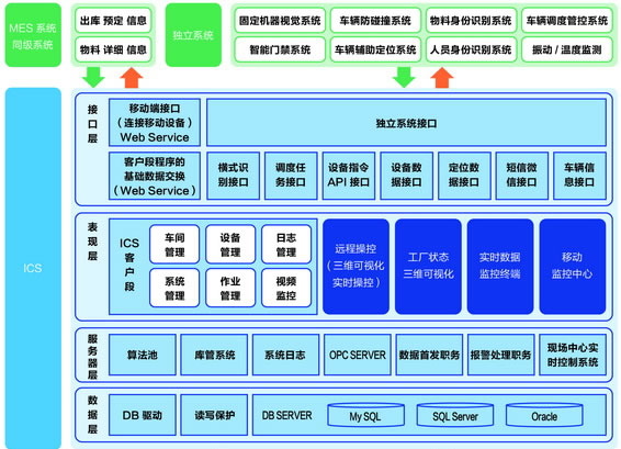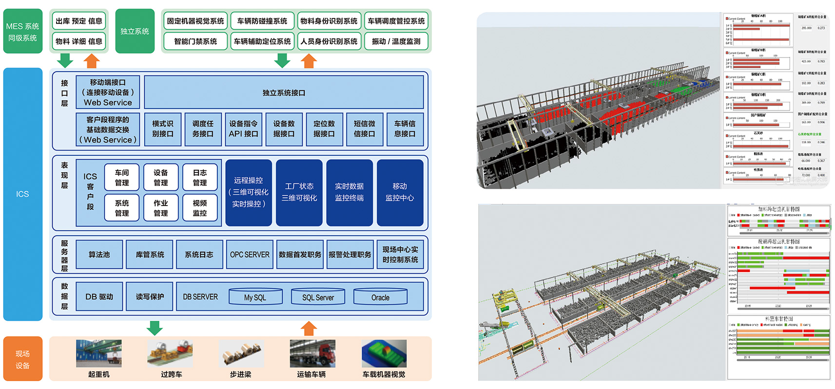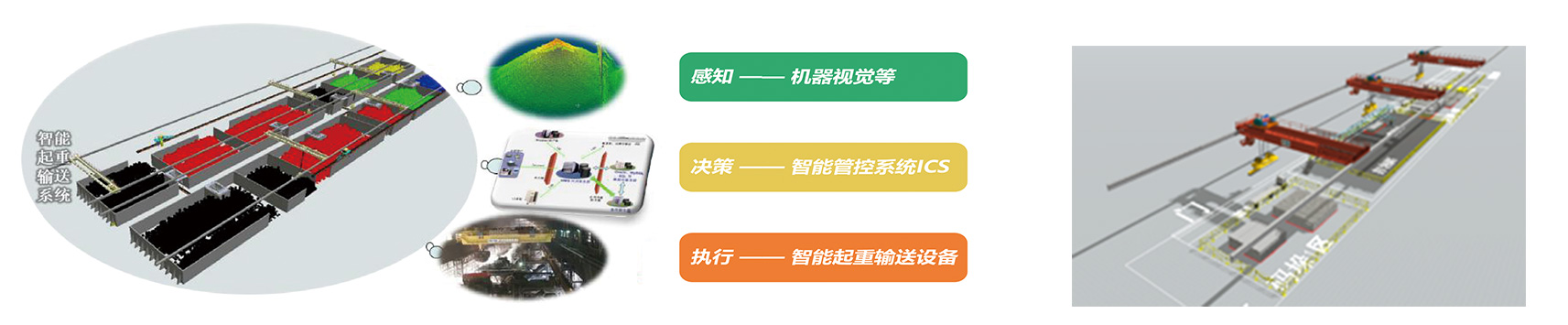 智能起重輸送是包含了庫區(qū)管理、調(diào)度算法、智能搬運等子系統(tǒng),形成了感知、決策、執(zhí)行的智能化整體解決方案。該系統(tǒng)在標(biāo)準(zhǔn)的生產(chǎn)流程、規(guī)范的操作過程的基礎(chǔ)上,通過位置傳感器、機(jī)器視覺等感知設(shè)備狀態(tài)、庫存狀態(tài)等環(huán)境信息,經(jīng)庫區(qū)智能管理系統(tǒng)分析后自主分解生產(chǎn)計劃,通過智能調(diào)度、路徑規(guī)劃等技術(shù)形成運行指令,通過自主控制、精確定位等技術(shù)由智能設(shè)備自主完成任務(wù)指令并反饋執(zhí)行結(jié)果。該系統(tǒng)還具有遠(yuǎn)程運維、云服務(wù)及移動推送等功能,實現(xiàn)全生命周期管理和現(xiàn)場實時監(jiān)控。