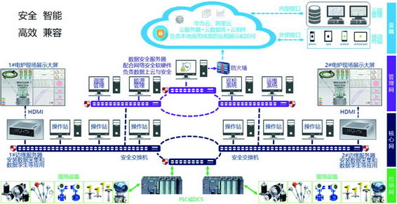 優(yōu)勢:包含控制網(wǎng)、核心網(wǎng)、管理網(wǎng)以及云端四級工廠網(wǎng)絡,兼容開放性好,設置軟硬件結(jié)合的縱深防御措施,安全性好,根據(jù)實時參數(shù),按照模型進行仿真,推薦合理的運行參數(shù),結(jié)合礦熱爐工藝參數(shù)、運行參數(shù),計算出電極工作端實際位置