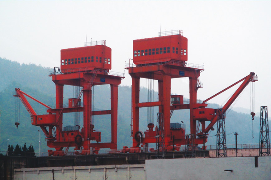 水電站門式起重機(jī)是一種門式多功能起重機(jī),主要工作于水電站大壩壩頂或尾平臺(tái),用于發(fā)電機(jī)組進(jìn)水口工作門、排沙底口事故檢修門、攔污柵、泄洪水閘平板工作門等各類閘門的啟閉、搬運(yùn),用于機(jī)電設(shè)備安裝及壩頂其他設(shè)備的吊運(yùn)等。大連重工研制的該類產(chǎn)品的主要技術(shù)特點(diǎn):起重量大(最大1000t)、超載能力強(qiáng)、跨度較小(常為10-20m)、起升高度大、配有自動(dòng)化或智能化的水下液壓掛梁,可采用各種先進(jìn)的電氣調(diào)速系統(tǒng)和PLC及網(wǎng)絡(luò)控制系統(tǒng)。
